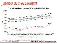 薬も近年DPP4やSGLT2という新しい作用の血糖降下薬の出現により血糖値やHbA1Cは改善されてきていますがBMIは増加傾向です。